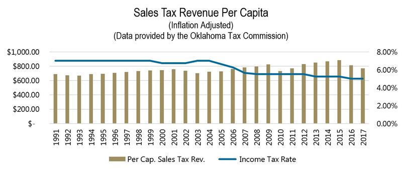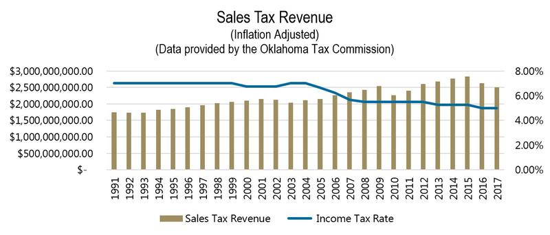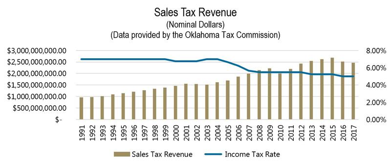 In a recent article, I showed that income tax cuts cannot explain Oklahoma’s recent budget challenges. And it was not only income tax revenue that increased after income tax cuts. Since 1991, income tax revenue has grown by $2.39 billion as the tax rate fell from 7% to 5%. Data from the Oklahoma Tax Commission show that these cuts also coincided with an increase in collections from the sales and use tax.