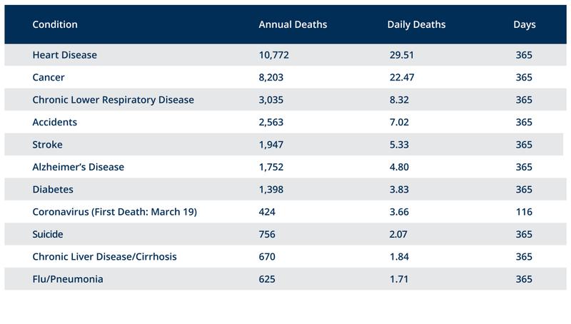 Dr. Paiva examined disease mortality data from 2017. Since the first COVID fatality in the state did not occur until March 19, 2020, and no one knows how many more deaths will take place before the end of the year, there is no way until then to compare mortality totals. However, he was able to extrapolate a daily death rate for the 11 leading causes of death in the state: