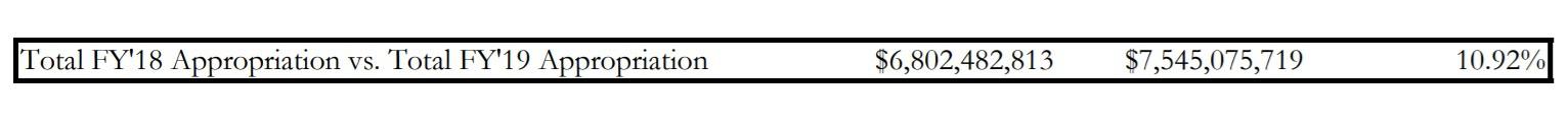 The picture below shows total fiscal year 2018 appropriations versus total fiscal year 2019 appropriations.